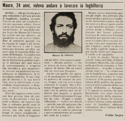«Era partito per Londra il 28 luglio di quell’anno passando per Friburgo, dove si era separato da un amico scoperto a viaggiare senza biglietto. Giunto in Gran Bretagna, alla frontiera era stato respinto perché senza lavoro e dunque era tornato in Italia, passando per Bologna il mattino della strage e perdendo la vita.