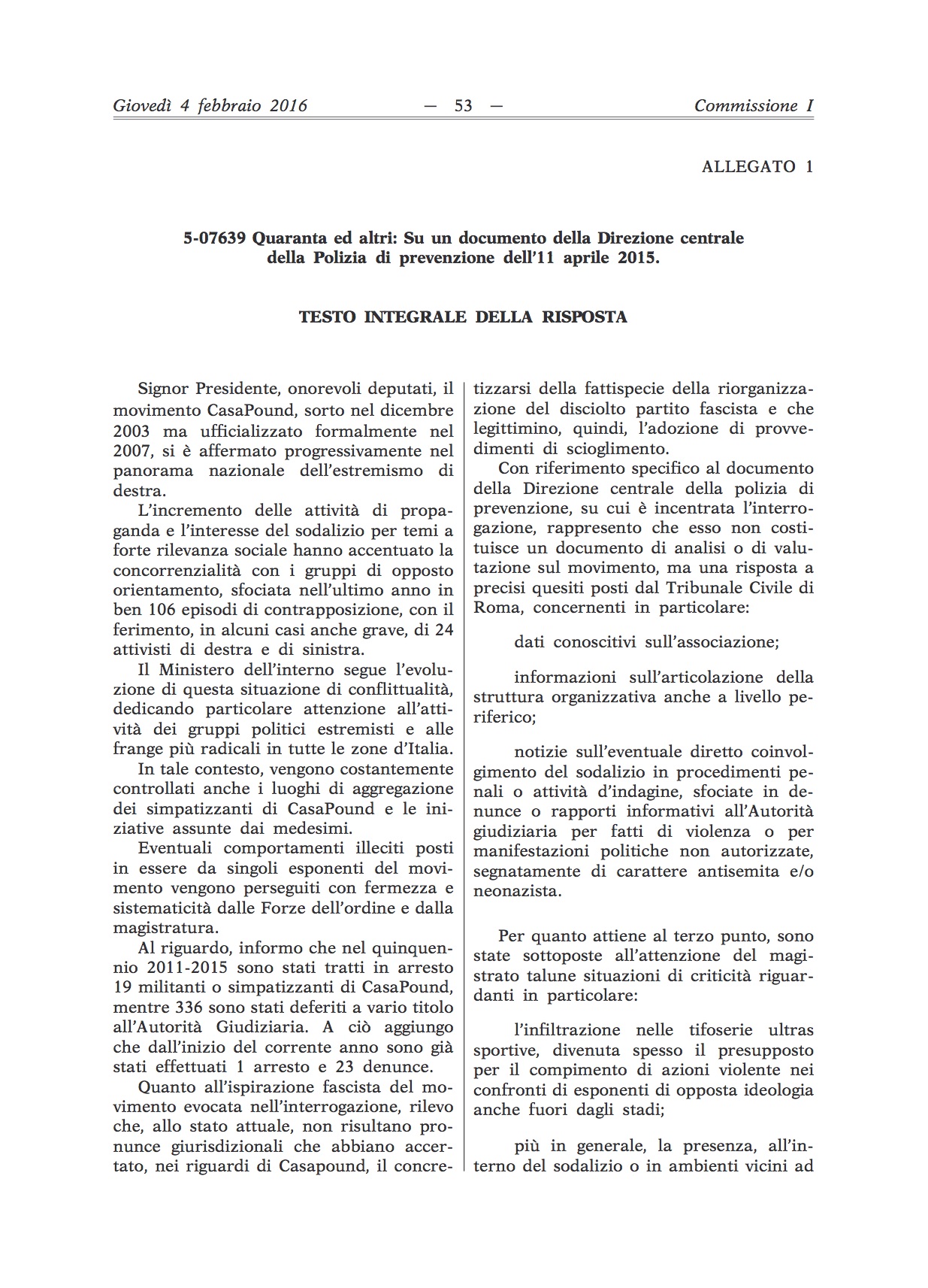 Risposta ministero 1 Published 11 aprile 2016 at 1235 × 1713 in CasaPound «un’associazione che vuole rilanciare il Fascismo». Il Gip di Roma ridimensiona l’informativa del Viminale