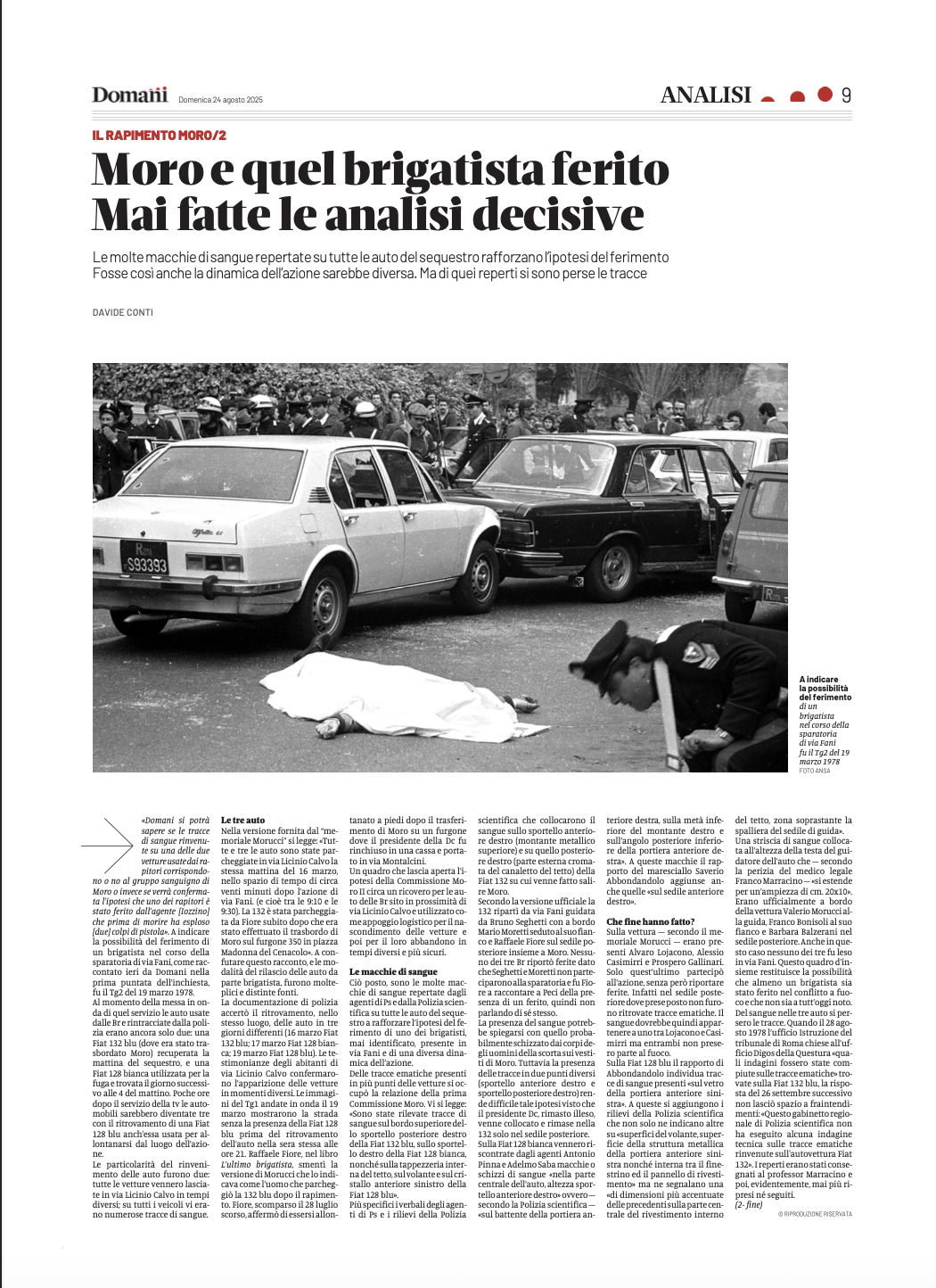 Davvero la mattina del 16 marzo 1978 a dare l’assalto alla scorta che trasportava il presidente del consiglio nazionale della Democrazia cristiana Aldo Moro c’era un undicesimo brigatista dall’identità tuttora ignota, rimasto ferito nello scontro a fuoco, e non i dieci accertati storicamente (le ricostruzioni giudiziarie si fermano a nove)? A sostenerlo, sulle pagine del quotidiano Domani del 23 e 24 agosto scorso, in un lungo articolo in due puntate dal titolo «Non fu geometrica potenza, il brigatista ferito in via Fani», è lo storico Davide Conti, per anni ricercatore presso la fondazione Basso, autore di lavori sulla Resistenza, soprattutto romana, e di varie pubblicazioni sul fascismo e neo fascismo, nonché consulente delle procura di Brescia e Bologna nelle indagini sulle stragi, e dell’Archivio storico del Senato della Repubblica.