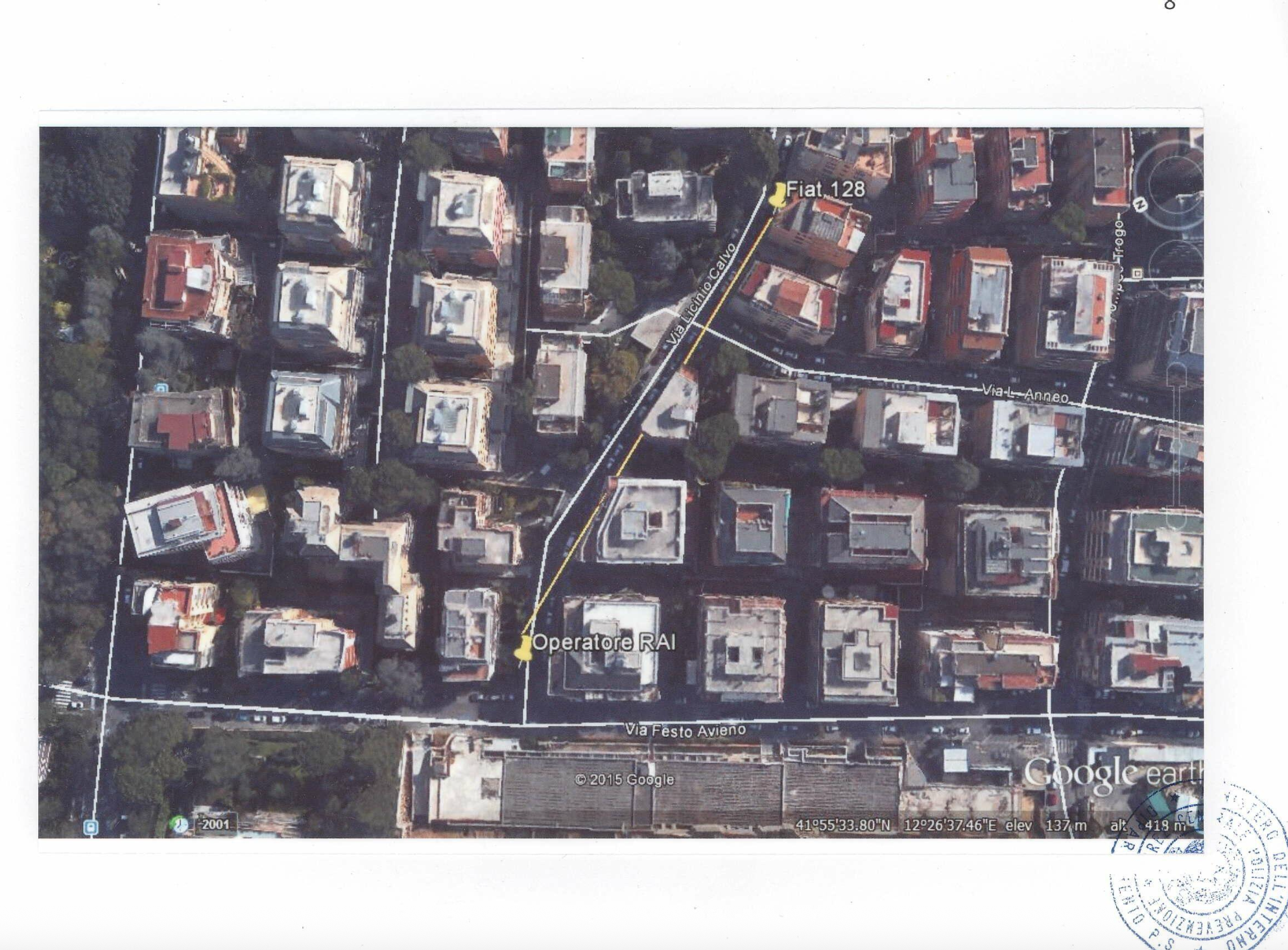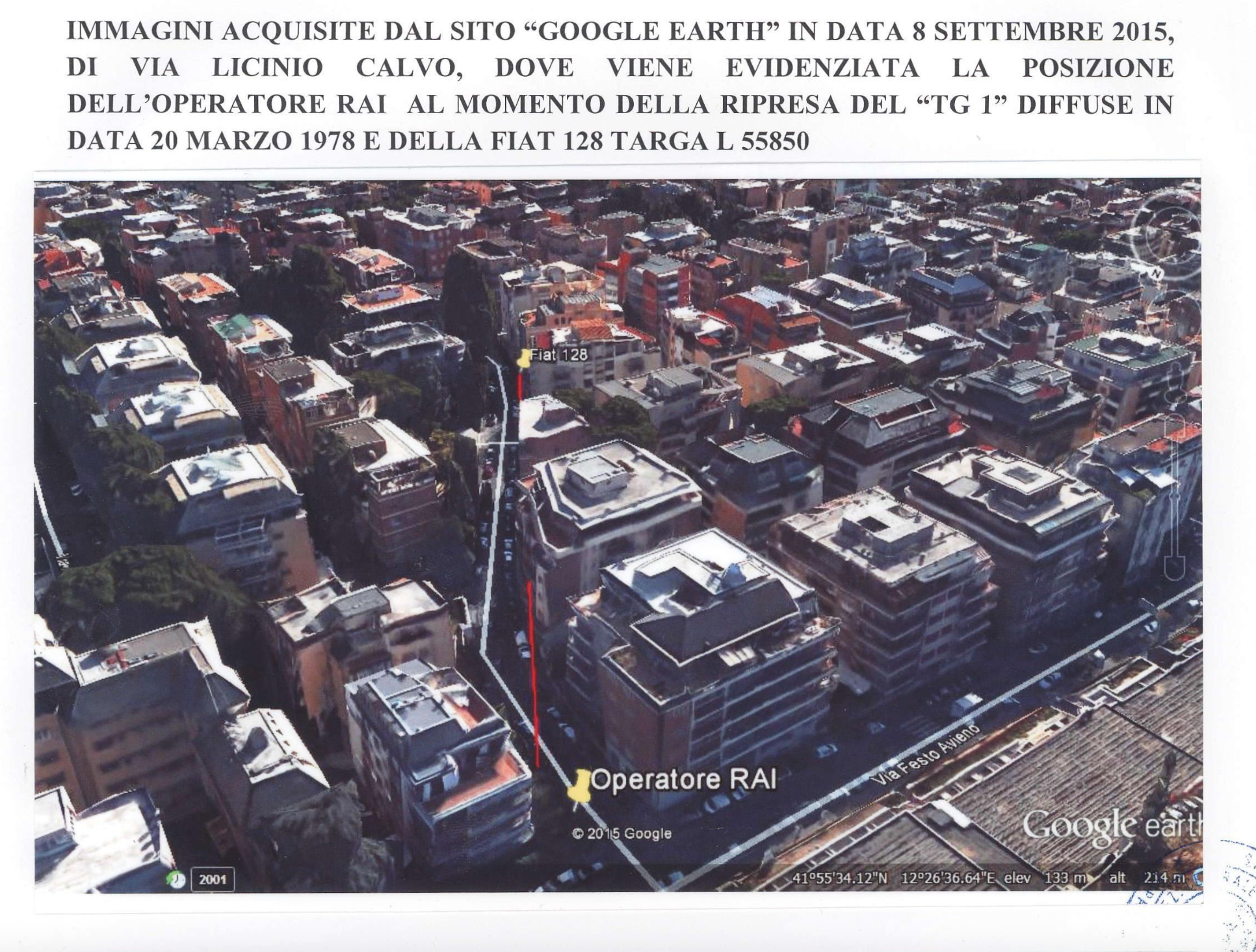 In effetti il mezzo, come ci ha confermato Fiore, aveva realizzato un percorso diverso dalle Fiat 128. In Brigate rosse (op. cit.) avevamo già segnalato la cosa, sottolinenando come la Fiat 132, ritardata dal trasbordo di Moro nel furgoncino Fiat 850 in piazza Madonna del Cenacolo, fosse partita quando le due Fiat 128 erano già andate via. Fiore ci rispose che nella concitazione saltò la svolta in via Licinio Calvo e fu costretto a proseguire via Festo Avieno fino in fondo, per girare a destra verso piazza Ennio e ridiscendere via Lucilio. Da qui il parcheggio poco accurato all’inizio di via Licinio Calvo che facilitò l’immediato ritrovamento del mezzo, la cui targa era stata già segnalata poco dopo la sparatoria in via Fani da diversi testimoni.
