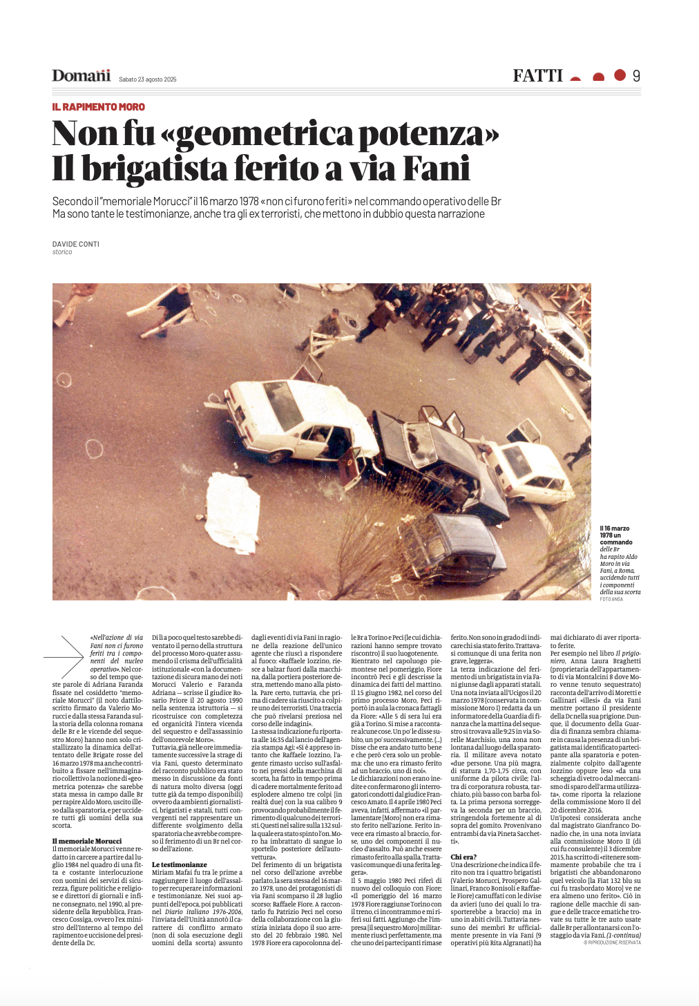Davvero la mattina del 16 marzo 1978 a dare l’assalto alla scorta che trasportava il presidente del consiglio nazionale della Democrazia cristiana Aldo Moro c’era un undicesimo brigatista dall’identità tuttora ignota, rimasto ferito nello scontro a fuoco, e non i dieci accertati storicamente (le ricostruzioni giudiziarie si fermano a nove)? A sostenerlo, sulle pagine del quotidiano Domani del 23 e 24 agosto scorso, in un lungo articolo in due puntate dal titolo «Non fu geometrica potenza, il brigatista ferito in via Fani», è lo storico Davide Conti, per anni ricercatore presso la fondazione Basso, autore di lavori sulla Resistenza, soprattutto romana, e di varie pubblicazioni sul fascismo e neo fascismo, nonché consulente delle procura di Brescia e Bologna nelle indagini sulle stragi, e dell’Archivio storico del Senato della Repubblica.