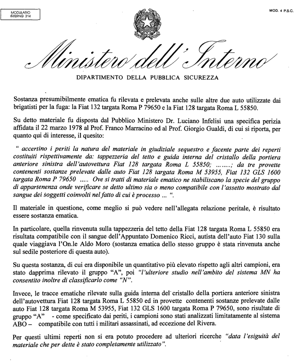 Dopo la richiesta del pm Luciano Infelisi, che dispose il 22 marzo 1978 una perizia sulle tracce di sangue e le impronte raccolte dalla polizia scientifica sulle vetture utilizzate dai brigatisti per individuarne l’appartenenza, secondo Conti, che cita una risposta della Digos del 26 settembre 1978 a un quesito posto dall’ufficio istruzione il 28 agosto precedente, le indagini scientifiche si sarebbero arenate. In realtà la perizia, assegnata ai professori Franco Marraccino e Giorgio Gualdi, venne consegnata il 14 novembre successivo al consigliere istruttore Achille Gallucci. Le conclusioni furono eloquenti: le tracce ematiche appartenevano a quattro dei cinque uomini della scorta di Moro. Il sangue rinvenuto sulla tappezzeria del tetto e sul sedile posteriore della Fiat 128 blu, targata Roma L55850, alla cui guida era salito Valerio Morucci che si era introdotto dopo la sparatoria nella Fiat 130 di Moro per raccogliere alcune borse, risultò compatibile con quello dell’appuntato Domenico Ricci, autista del mezzo sulla quale viaggiava Moro. Altre tracce ematiche rilevate sulla portiera anteriore sinistra della Fiat 128 blu e in provette contenenti sostanze prelevate dalla Fiat 128 bianca, targata Roma M53955, nella quale era salito Prospero Gallinari, e dalla Fiat 132 GLS 1600, targata Roma P79650, guidata da Bruno Seghetti e dove salirono Aldo Moro, Mario Moretti e Raffaele Fiore, sono risultate del gruppo “A”, compatibile con tutti i militari uccisi a eccezione di Rivera. A chiarire definitivamente la vicenda è un rapporto della dottoressa Laura Tintisona, funzionaria di polizia distaccata presso la commissione Moro 2, presieduta da Giuseppe Fioroni, depositato il 14 dicembre 2014 (Cf. CM2 0470_001). La data è significativa poiché il consulente della Commissione Moro 2, Gianfranco Donadio, citato da Conti, divenne consulente solo nel febbraio successivo, tralasciando quanto prodotto in precedenza dalla Commissione stessa.