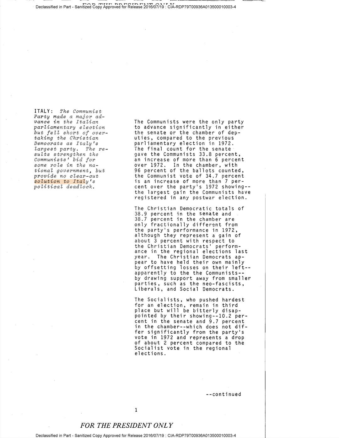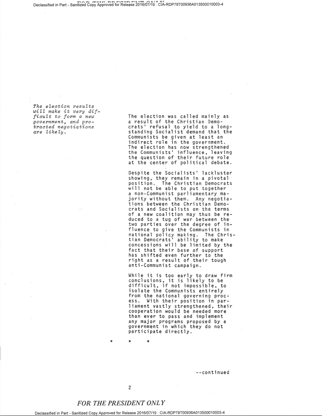 «Mentre è troppo presto per trarre conclusioni definitive – riferivano gli analisti della Cia – è probabile sia molto difficile, se non impossibile, isolare completamente i comunisti dal processo di governo nazionale. Con la loro posizione notevolmente rafforzata in parlamento, la loro cooperazione sarà più che mai necessaria per approvare e attuare qualsiasi progetto importante proposto da un governo nel quale non siano presenti».