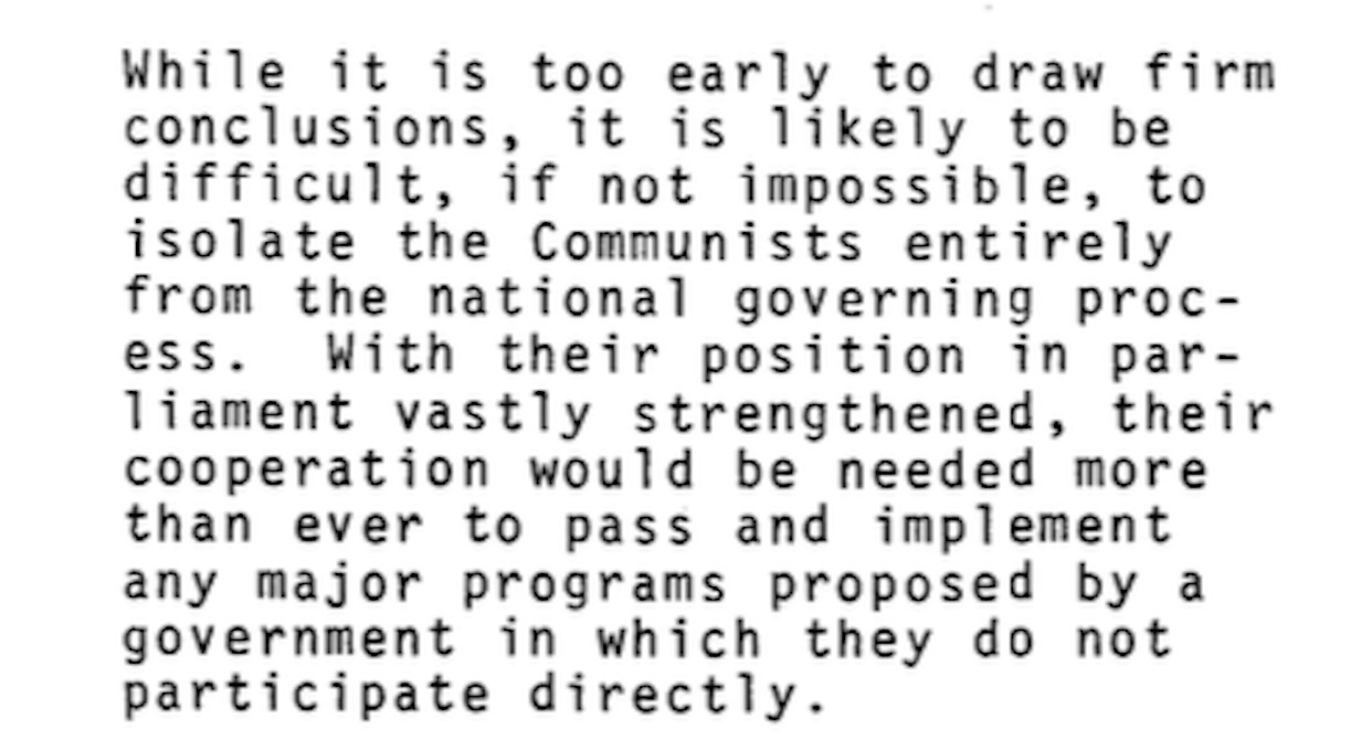 «Mentre è troppo presto per trarre conclusioni definitive – riferivano gli analisti della Cia – è probabile sia molto difficile, se non impossibile, isolare completamente i comunisti dal processo di governo nazionale. Con la loro posizione notevolmente rafforzata in parlamento, la loro cooperazione sarà più che mai necessaria per approvare e attuare qualsiasi progetto importante proposto da un governo nel quale non siano presenti».