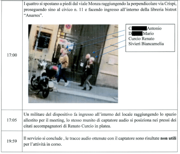 Oltre ad Azzolini e alla moglie Bianca Amelia Sivieri, tra i più gettonati nelle intercettazioni e servizi di ocp disposti dal’Arma, c’è Renato Curcio e il suo entourage familiare (nel fascicolo si trova addirittura una conversazione con moglie e figlia, priva di qualunque legame con l’inchiesta in corso, sulla guerra Russo-Ucraina da pochi giorni iniziata), a causa dei suoi frequenti viaggi di lavoro. Ad ottobre e novembre 2022 e poi nel successivo febbraio 2023, Curcio si reca a Milano dove presenta il suo libro sul Capitalismo cibernetico, e tiene dei cicli di conferenze. Ogni volta ad attenderlo al suo arrivo in stazione centrale, oltre ai carabinieri c’è sempre la stessa persona, Antonio C. che fa il tassista e lo ospita nella sua casa. Si tratta di un amico della Sivieri a cui si aggrega anche una terza persona, Mario D., amico di entrambi. Quest’ultimo aveva ospitato la moglie di Curcio, Marita Prette, nel novembre precedente. Ne scrivono i carabinieri a causa di una telefonata intercettata in cui «Prette dice a Curcio che da casa di Mario (ndr. Mario D.) si vede una giornata limpida».