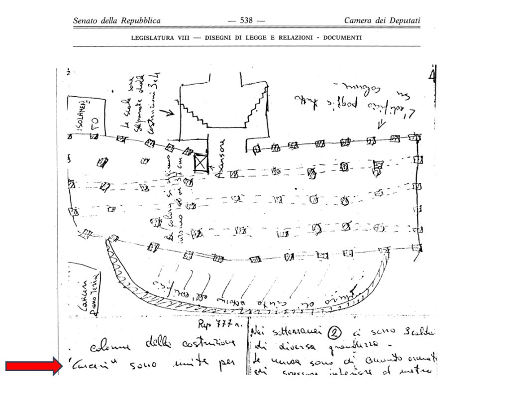 Zatti, a ragione, sostiene che l’immagine sopra sia più o meno nota. Difatti, fu inserita dal giornalista Paolo Cucchiarelli in una delle sue pubblicazioni, voglia perdonarmi l’autore se non ricordo esattamente quale. Fu pubblicata anche sulla piattaforma social di un noto gruppo Facebook (Sedicidimarzo), dall’amministratore Franco Martines, in data 13 settembre 2023. Fui io stesso a darla a Martines, unitamente all’altra mostrata in tv da Zatti, che a breve riproporrò. Soltanto queste 2. Ma, a differenza di Zatti, diedi gli «originali», quelli conservati presso l’archivio della Corte d’Assise di Roma (aula bunker di Rebibbia), non quelli acquisiti dalla commissione Moro. Come si vedrà, questo è un punto fondamentale. Difatti, bisogna preliminarmente precisare, sottolineare, e rimarcare, che il rep. n. 777 non è composto soltanto da quelle due immagini mostrate a Porta a Porta. Esistono altri fogli-foglietti manoscritti, soprattutto descrittivi che, oltre a rappresentare gli anelli di congiunzione di un’entità unitaria (i teorici della Gestalt avrebbero detto che il tutto è più della somma delle parti), raccontano una storia nettamente contrapposta. Ora, devo presumere che Zatti non avesse nella sua disponibilità queste altre tessere, ciò è evidente, in caso contrario non avrebbe proseguito per la sua strada, oppure, le avrebbe mostrate in tv. Lo suppongo anche in base a un altro ragionamento: avendo estrapolato quelle due immagini dalla commissione, si è ritrovato senza null’altro in mano, perché l’organo parlamentare, per quanto consta al sottoscritto, non acquisì il rep. n. 777 in forma integrale, ma soltanto quelle due immagini. (2) Pertanto, sul punto specifico, l’autore dell’inchiesta ha proceduto per sottrazione, forse a causa di una pregressa impreparazione sul carteggio Moro. Ad ogni buon conto, già le descrizioni che si trovano all’interno delle due immagini mostrate a Porta a Porta, avrebbero dovuto farlo riflettere e penetrare più a fondo la spinosa vicenda, perché già in quelle poche righe, anche se non vi è alcun cenno alle cariche esplosive, si fa comunque riferimento a: spessore delle colonne, sotterranei, caldaie, muri in foratelle, travi in cemento armato, canali tra una cella e l’altra dove passano i tubi… Ma sul punto specifico, Zatti ha derubricato il tutto sostenendo che fu proprio la parola “carceri” inserita tra le virgolette (nell’immagine sotto contrassegnata dalla freccia rossa) a fuorviare gli inquirenti dell’epoca. A suo giudizio, il segno tipografico andava letto oltre le righe: i brigatisti non intendevano riferirsi alle case circondariali, bensì, alla prigione dove tenevano sequestrato Moro. Il classico esempio di ciò che si vuole far combaciare a tutti i costi.