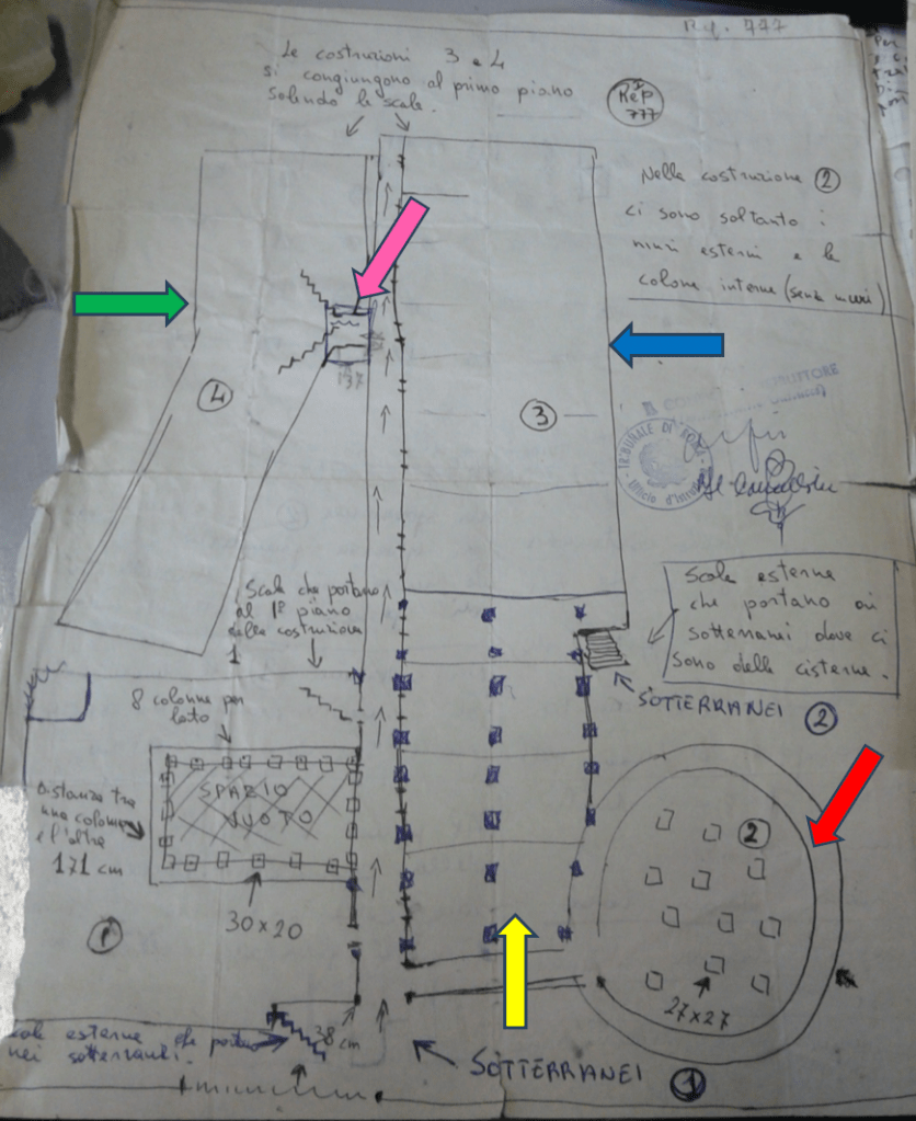 La parte segnalata in grassetto dal sottoscritto corrisponde esattamente a ciò che scrissero i brigatisti in una delle due planimetrie: «Al piano terra non ci sono ancora i muri divisori» (freccia rossa immagine sottostante).