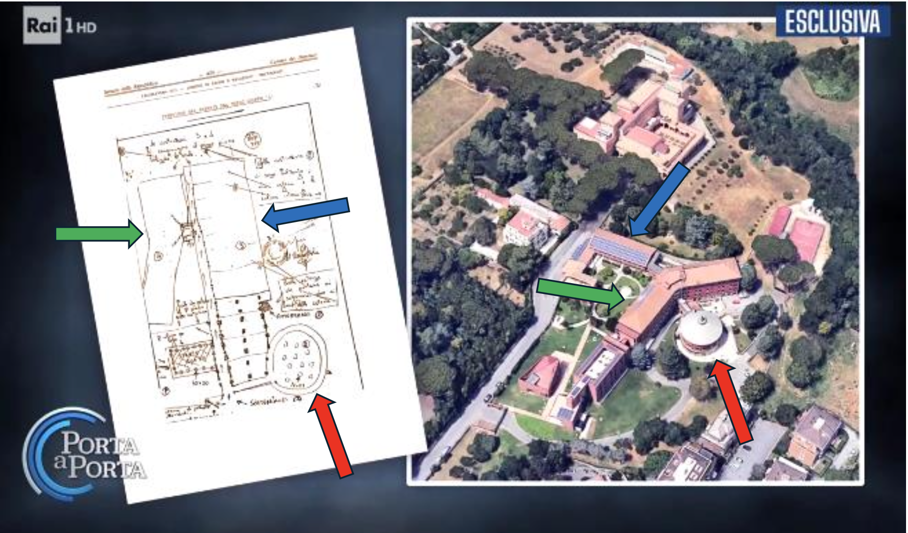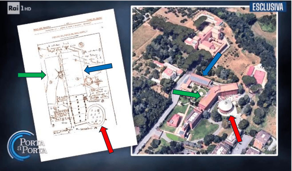 L’immagine a sinistra è la planimetria ritrovata in via Gradoli, rep. n. 777. Quella a destra è la sede della Loyola University, sito in cui, a detta di Zatti, le Brigate Rosse avrebbero tenuto prigioniero Moro, almeno nelle fasi iniziali. Osservandole bene, qualche similitudine effettivamente esiste, il resto bisogna farlo incastrare. 1) L’elemento sferico, identificato con la freccia rossa, trova una certa corrispondenza. 2) Ma il complesso centrale, identificato nel disegno di sinistra con la freccia blu, anche se lo si volesse far corrispondere con l’edificio dell’immagine di destra, sempre contrassegnato con la freccia blu, si troverebbe comunque in una posizione diversa rispetto all’elemento sferico, ovvero, alla sua destra, non a sinistra come nella planimetria rinvenuta in via Gradoli. 3) Quella specie di parallelepipedo, contrassegnato dalla freccia verde nel disegno di sinistra, per farlo coincidere con quello della freccia verde dell’immagine di destra, bisogna ruotarlo e adattarlo.