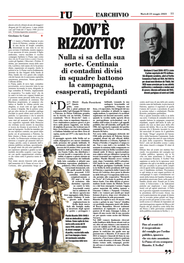 «“Dov’è Rizzotto?” Questo grido, scandito a pieni polmoni dal segretario della Cgil Giuseppe Di Vittorio a Palermo, in Piazza Politeama gremita, me lo ricordo con un brivido. Gridava scandendo “Do-vè Ri-zzo-tto” tante e tante volte, come se aspettasse risposta, e l’eco rimbombava passava girava si perdeva nella piazza raggelata, con decine di migliaia di persone che trattenevano il fiato e le lacrime», racconta un testimone a Giuliana Saladino nel suo libro Terra di rapina, uscito nel 1977 e che tanto fece discutere.