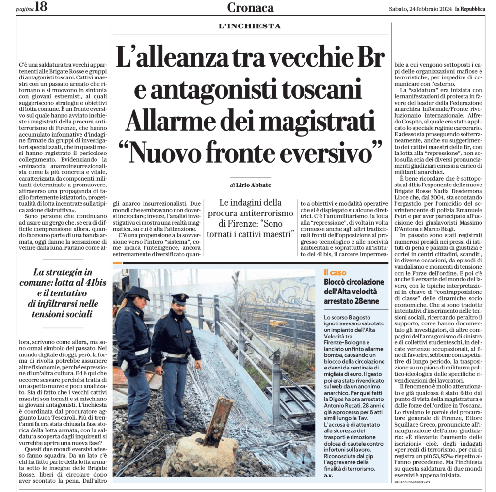 Il succo è la criminalizzazione preventiva del dissenso, dell’oppposizione sociale o peggio il farsi strumento di una provocazione per poi accendere i terminali delle intercettazioni telefoniche e ambientali e infine tirare la rete delle chiacchiere. Quando il giornalista si fa arma dell’inquisitore e la stampa serve a costruire indagini e criminalizzare comportamenti sociali.
