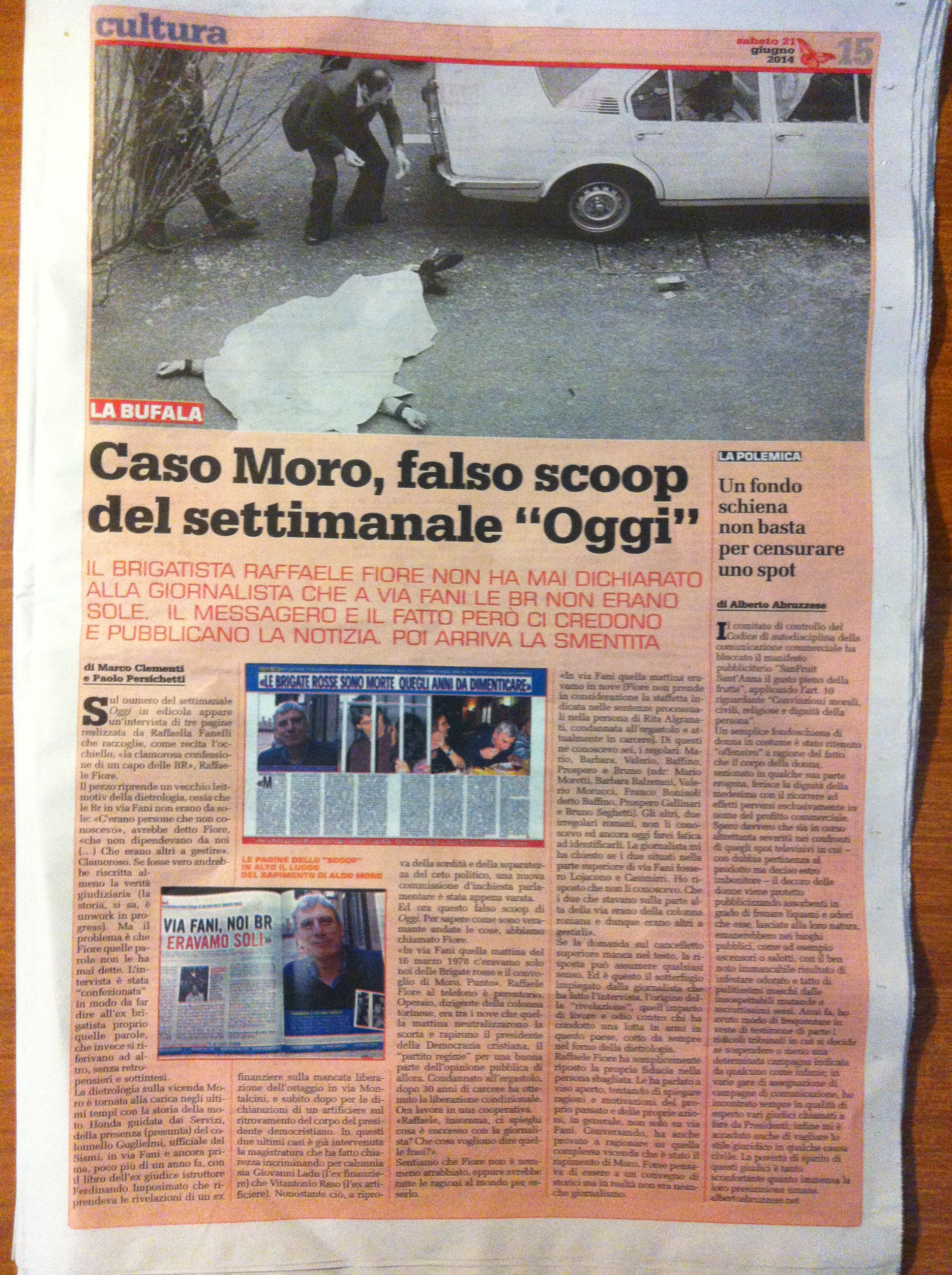Ora giungono le dichiarazioni (presunte) di Fiore, uno che a via Fani c’era, apparse sul numero di “Oggi” in edicola: un’intervista di tre pagine realizzata da Raffaella Fanelli che raccoglie, come recita l’occhiello, «la clamorosa confessione di un capo delle BR».