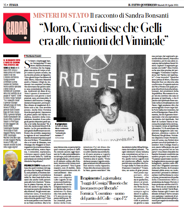 Ancora una volta la figura di Gelli e della P2 vengono convocate attraverso le parole di un defunto per coprire l’operato di questo pezzo importante di ceto politico, la scelta voluta da Pci-Andreotti e Zaccagnini di non convocare il parlamento per lunghi mesi, tanto che nemmeno alla notizia della morte di Moro si aprì una discussione per il timore fondato che un dibattito alla Camere, dando voce ai dissenzienti che chiedevano di trattare, avrebbe scatenato una inevitabile crisi di governo sfaldando il fragile patto consociativo. Solo la pubblicazione del memoriale difensivo di Moro, il testo dattiloscritto trovato dopo l’irruzione dei carabinieri di Dalla Chiesa nella base Br di via Montenevoso, costrinse il parlamento, ben cinque mesi dopo la morte del leader Dc, a discutere del rapimento e della sua morte.