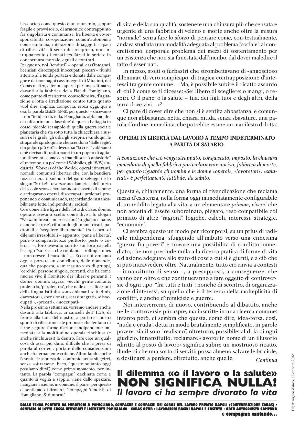 Non abbiamo paura di doverci scontrare fra proletari, e con altri proletari: a Taranto è oggi chiarissimo, non c’è chi non possa vederlo, che la coppia lavorismo-statalismo, l’identificarsi come forza-lavoro, “capitale variabile” (con tutte le ideologie di sostituzione, di diversione, che ne derivano), costituisce la forma specifica, autodistruttiva, di una “controinsurrezione preventiva” nel seno stesso delle moltitudini sfruttate, oggetto di sopraffazione, di tentativo incessante di vampirizzarne la potenza, e lasciare il frutto spremuto, schiacciarlo fino all’annichilazione.