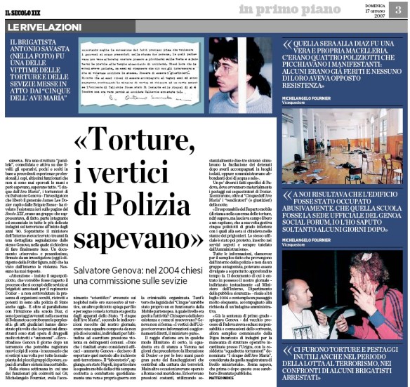Dopo il Corriere della sera anche sulle pagine di Repubblica, il quotidiano di tutte le emergenze e fermezze nazionali, del più feroce rigor mortis, sostenitore imperterrito di polizia e magistratura, grazie ad Adriano Sofri si parla delle torture impiegate per contratstare la lotta armata degli anni 70 e inizio 80, ma non solo. A differenza degli altri pezzi, questa volta l’intervento di Sofri non ha richiami in prima ma si trova confinato nella pagina delle lettere, nella tribuna dedicata alle opinioni marcatamente esterne, estemporanee, a sottolineare la presa di distanza da qusta vicenda della nave ammiraglia scalfariana. Nonostante ciò il muro del silenzio ogni giorno che passa mostra sempre nuove crepe