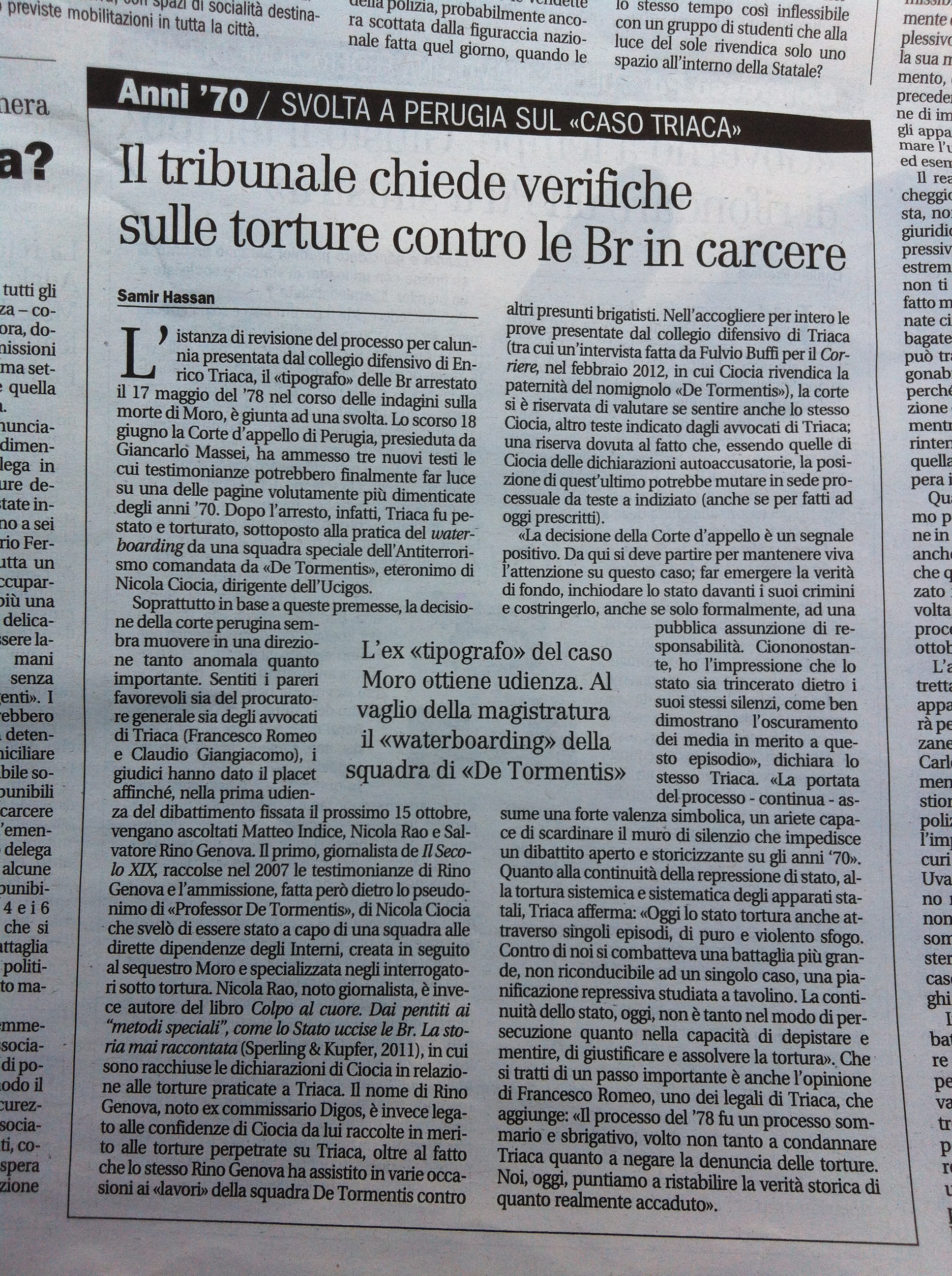 L’istanza di revisione del processo per calunnia presentata dal collegio difensivo di Enrico Triaca, il tipografo delle Br arrestato il 17 maggio del ’78 nel corso delle indagini sulla morte di Moro, è giunta ad una svolta. Lo scorso 18 giugno la Corte d’appello di Perugia, presieduta da Giancarlo Massei, ha ammesso tre nuovi testi le cui testimonianze potrebbero finalmente far luce su una delle pagine volutamente più dimenticate degli anni ’70. Dopo l’arresto, infatti, Triaca fu pestato e torturato, sottoposto alla pratica del waterboarding da una squadra speciale dell’Antiterrorismo comandata da “De Tormentis”, eteronimo di Nicola Ciocia, dirigente dell’Ucigos. Soprattutto in base a queste premesse, la decisione della corte perugina sembra muovere in una direzione tanto anomala quanto importante. Sentiti i pareri favorevoli sia del procuratore generale sia degli avvocati di Triaca (Francesco Romeo e Claudio Giangiacomo), i giudici hanno dato il placet affinché, nella prima udienza del dibattimento fissata il prossimo 15 ottobre, vengano ascoltati Matteo Indice, Nicola Rao e Salvatore Rino Genova. Il primo, giornalista de Il Secolo XIX, raccolse nel 2007 le testimonianze di Rino Genova e l’ammissione, fatta però dietro lo pseudonimo di “ Professor De Tormentis”, di Nicola Ciocia che svelò di essere stato a capo di una squadra alle dirette dipendenze degli Interni, creata in seguito al sequestro Moro e specializzata negli interrogatori sotto tortura. Nicola Rao, noto giornalista, è invece autore del libro Colpo al cuore. Dai pentiti ai “metodi speciali”, come lo Stato uccise le BR. La storia mai raccontata (Sperling & Kupfer, 2011), in cui sono racchiuse le dichiarazioni di Ciocia in relazione alle torture praticate a Triaca. Il nome di Rino Genova, noto ex commissario Digos, è invece legato alle confidenze di Ciocia da lui raccolte in merito alle torture perpetrate su Triaca, oltre al fatto che lo stesso Rino Genova ha assistito in varie occasioni ai “lavori” della squadra De Tormentis contro altri presunti brigatisti. Nell’accogliere per intero le prove presentate dal collegio difensivo di Triaca (tra cui un’intervista fatta da Fulvio Buffi per il Corriere, nel febbraio 2012, in cui Ciocia rivendica la paternità del nomignolo “De Tormentis”), la corte si è riservata di valutare se sentire anche lo stesso Ciocia, altro teste indicato dagli avvocati di Triaca; una riserva dovuta al fatto che, essendo quelle di Ciocia delle dichiarazioni autoaccusatorie, la posizione di quest’ultimo potrebbe mutare in sede processuale da teste a indiziato (anche se per fatti ad oggi prescritti).