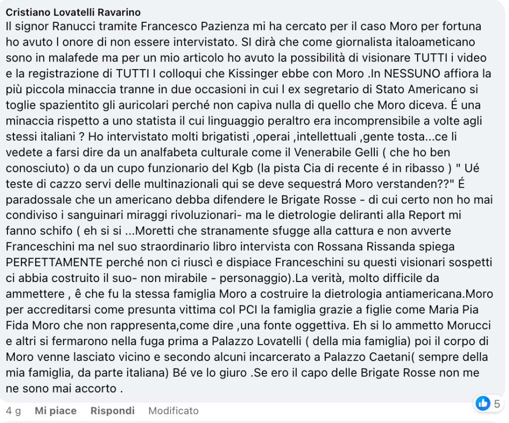 E sì che Morando conosce l’autorevole parere di Feltrinelli stesso, in quanto -se stranamente gli era sfuggito il noto libro di Panvini “Ordine nero e guerriglia rossa” dove le parole di Feltrinelli sono citate- non può però avere dimenticato il prolungato scambio di commenti su FB tra noi due, con la partecipazione di altri, avvenuto ai primi di marzo del 2022.