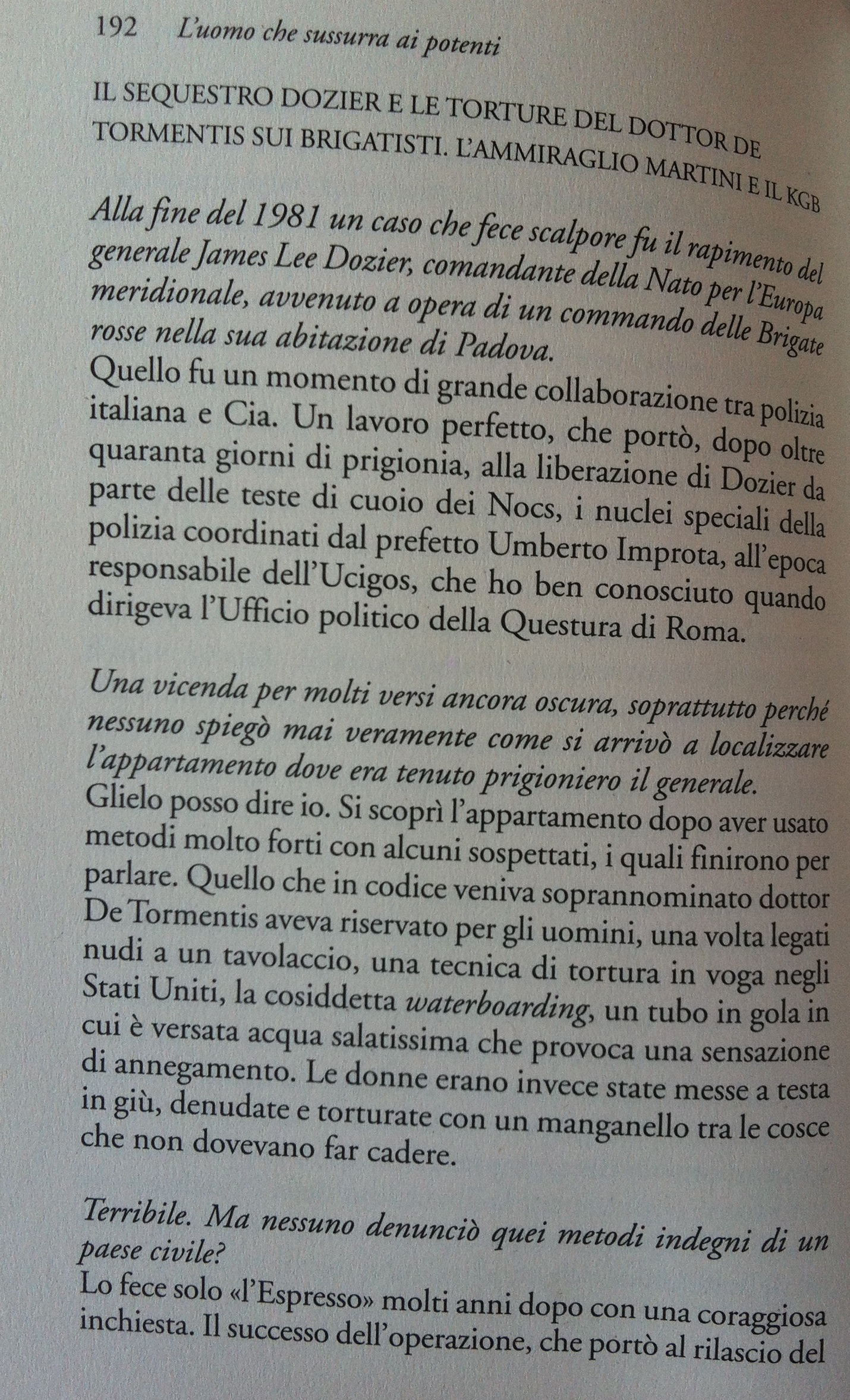 In un libro-intervista, L’uomo che sussurra ai potenti, appena apparso per Chiarelettere, rispondendo alle domande del giornalista Paolo Madron, Bisignani si diverte a raccontare retroscena, piccoli segreti, gossip, lo fa con ironia, schizza ritratti velenosi di personaggi della finanza, della politica, della chiesa, della magistratura (tra i più gustosi), dei Servizi segreti, dei media, in altri casi è servile, appare un magiordomo del potere, ogni tanto rivela qualche verità. Tra queste, in una paginetta e mezza racconta delle torture condotte nel 1982 dalla squadra del professor De Tormentis, ovvero quel Nicola Ciocia che i lettori assidui di questo blog conoscono molto bene. Se un frequentatore del potere come Bisignani sapeva, quanti altri come lui sapevano?