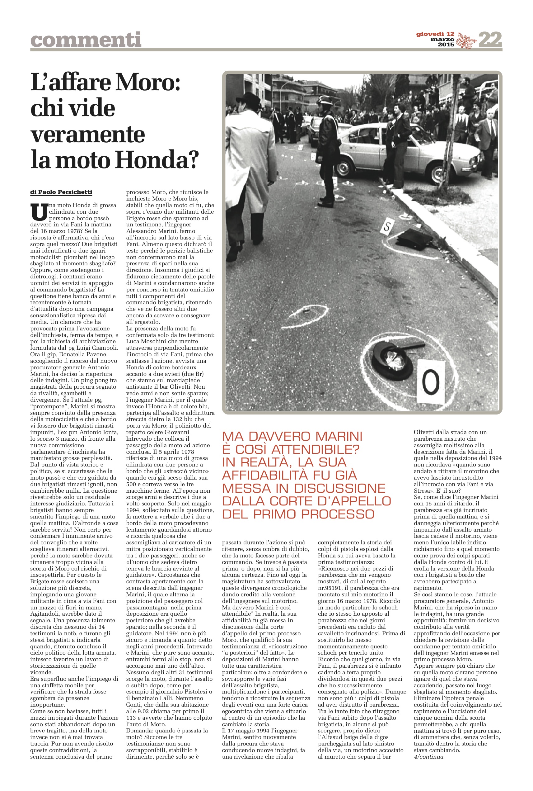 L’autore sembra ignorare le conclusioni dell’indagine realizzata nel settembre del 2015 dal Servizio centrale antiterrorismo per conto della commissione Moro 2. L’accertamento ha definitivamente smentito questa narrazione tossica. Il punto di ripresa dell’operatore tv, che ha girato le immagini il 19 marzo ma diffuse dal servizio del tg1 il 20 marzo 1978, non aveva alcuna visibilità sul tratto di via dove le due Fiat 128, la bianca e la blu, erano state lasciate dai brigatisti il 16 marzo precedente. Quelle immagini non hanno mai provato nulla (Cf. Cm2 0329_009). Recentemente una inchiesta pubblicata dal sito Sedicidimarzo sulle foto riprese dalla polizia scientifica al momento del ritrovamento della Fiat 128 bianca (Cf. https://www.sedicidimarzo.org/2024/01/peccato-che-sia-cosi-buia-o-della.html) ha mostrato come sul posto fosse già presente la Fiat 128 blu, autovettura sulla quale erano poggiati distrattamente alcuni agenti di polizia.