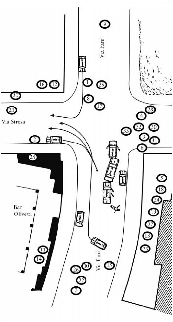 In effetti il mezzo, come ci ha confermato Fiore, aveva realizzato un percorso diverso dalle Fiat 128. In Brigate rosse (op. cit.) avevamo già segnalato la cosa, sottolinenando come la Fiat 132, ritardata dal trasbordo di Moro nel furgoncino Fiat 850 in piazza Madonna del Cenacolo, fosse partita quando le due Fiat 128 erano già andate via. Fiore ci rispose che nella concitazione saltò la svolta in via Licinio Calvo e fu costretto a proseguire via Festo Avieno fino in fondo, per girare a destra verso piazza Ennio e ridiscendere via Lucilio. Da qui il parcheggio poco accurato all’inizio di via Licinio Calvo che facilitò l’immediato ritrovamento del mezzo, la cui targa era stata già segnalata poco dopo la sparatoria in via Fani da diversi testimoni.