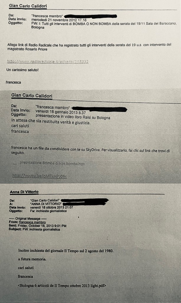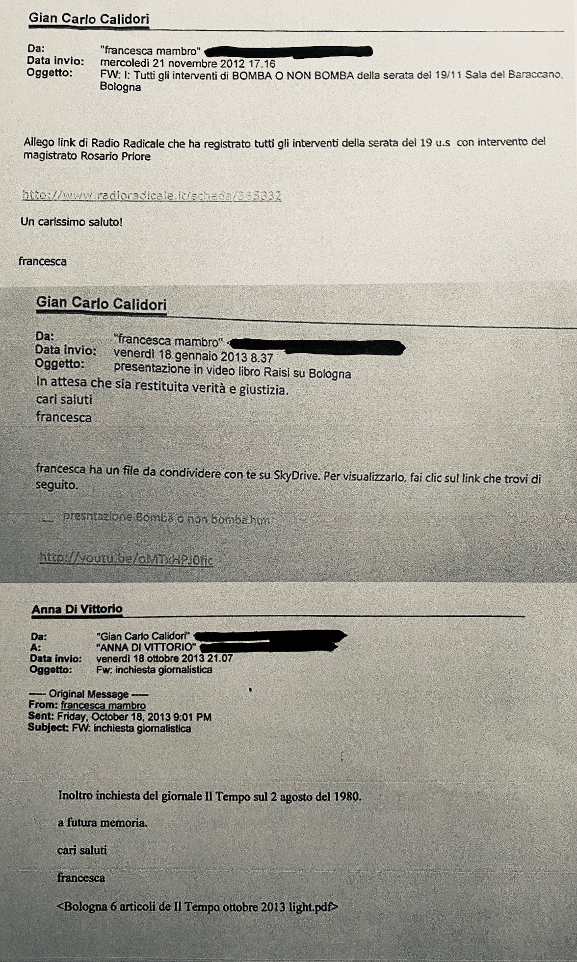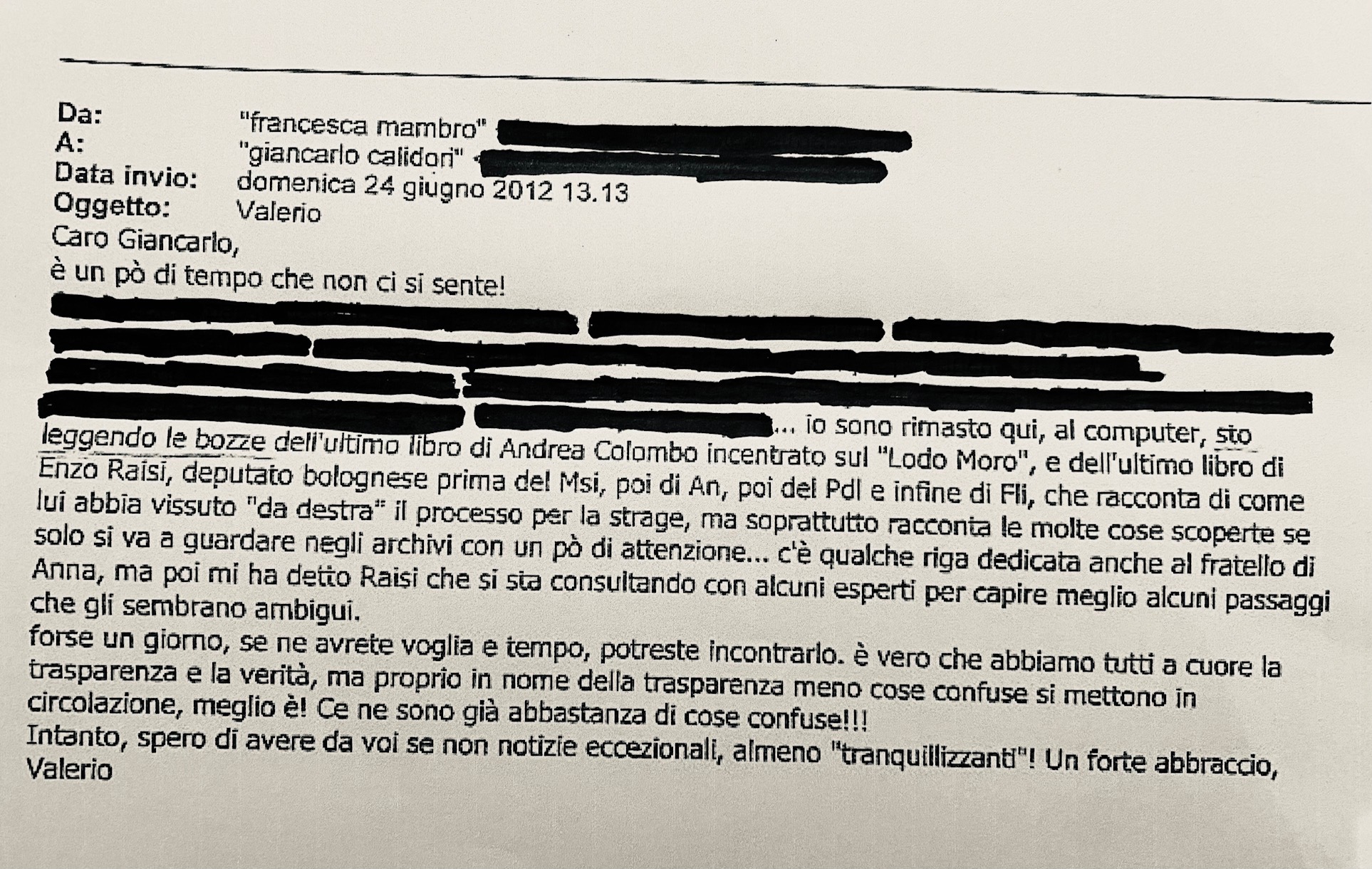 Si noti come Valerio Fioravanti, che nella prima mail del 21 giugno 2012 auspicava addirittura un possibile incontro con Raisi, ormai non scrive più.