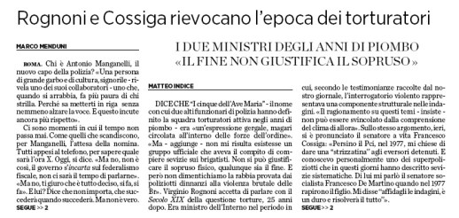 (il Sindacato Autonomo di Polizia): ” Non ci sono state torture ai terroristi arrestati. Se qualche episodio di violenza fosse avvenuto, sarebbe un fatto isolato. I responsabili, una volta accertata la loro colpa, dovrebbero essere puniti secondo la legge. Nella polizia non ci sono aguzzini o squadre speciali, ma solo persone normali e padri di famiglia. […]